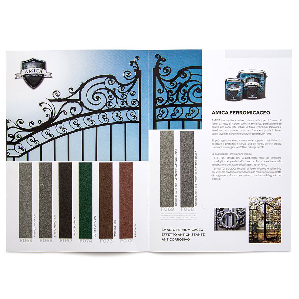 AMICA “FERROMICACEO” (Ossido di Ferro Micaceo) dà ottimi risultati estetici se sovrapposto con vernici Flatting lucide o opache. Questa soluzione aumenta le prestazioni, la resistenza del film e ne consente una facile pulizia.